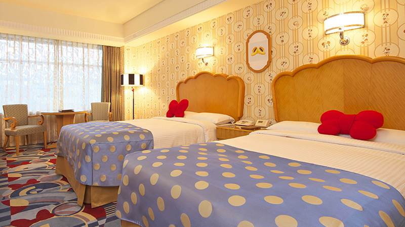 - Minnie Mouse motifs can be found all over this room type, from the beds to the carpet and even the wallpaper, which features Minnie in a variety of poses. Additionally, guests will receive a special pouch inspired by the decor of the room. Each room comes with two drawstring bags with a design inspired by the pajamas that Minnie Mouse wears during the character greeting. Guests can take these bags home as a memento of their stay.