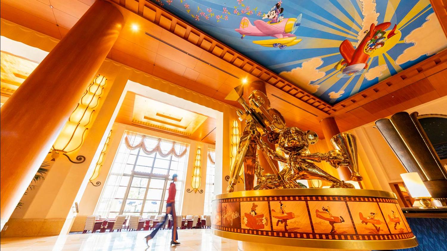 - Disney Ambassador Hotel is filled with motifs of Disney characters in various areas throughout the hotel, including the vaulted ceiling of the main entrance lobby featuring a mural of Disney friends operating an airplane from the 1930s, which is the historical setting of the hotel, as well as a golden statue of Mickey as a movie director standing together with Pluto at the center of the lobby.