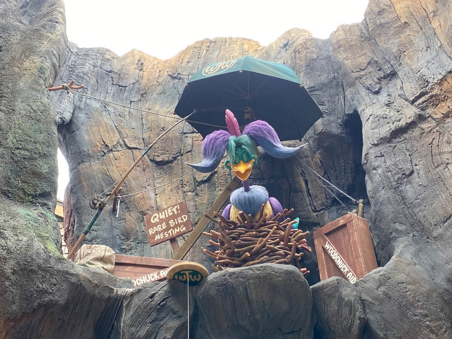 We’ll end our tour of Tokyo Disneyland over at Camp Woodchuck, an expansion to Frontierland which opened in 2016. A delightful restaurant themed to a lodge, the Camp Woodchuck Kitchen, is the main feature, along with a meet & greet area for Donald and Daisy. However, on the route to the meet & greet, there’s a beautiful pathway alongside the Rivers of America. Along this pathway, you’ll come across a giant redwood tree, which features in it a surprise animatronic of the Tri-Crested Tittertwill bird. You’ll hear it snoring, waking up and just enjoying its perch. A wonderful, unexpected place to find a simple animatronic, that brought quite the smile to my face.