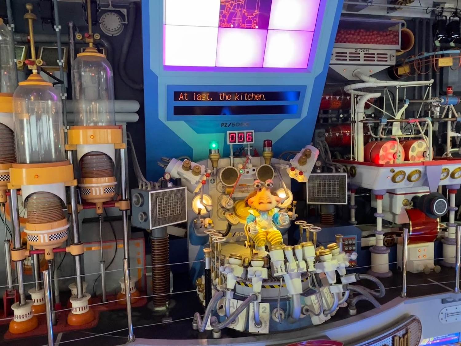 We begin by stepping into one of the most delightful counter service restaurants at any Disney park, the fantastic Pan Galactic Pizza Port, featuring my friend and yours – Tony Solaroni! Above the ordering area, you’ll find this cute animatronic alongside an impressive pizza making machine. Above Tony, a video of pure 90s goodness plays – which really feels like a classic thing out of EPCOT Center. Of course, during peak dining times, the restaurant will likely get pretty busy. But if you head in here during off-peak times, you’ll find plenty of seating on the upper level with a front row view of Tony.