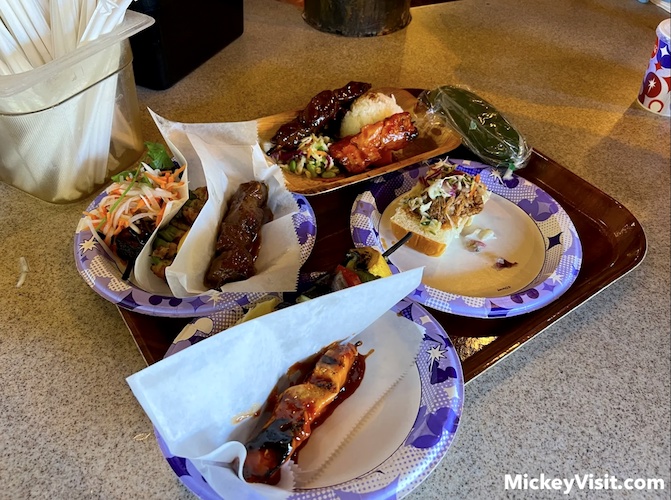 This option is filling and also one of the reasonably healthier Disneyland foods to snack on compared to some of the other options you’ll find in the parks. It’s hard to find something here that is not packed with delicious flavor, but some of our favorites are the Banyan Beef Skewer, Outback Vegetable Skewer, Safari Skewer (featuring bacon and asparagus), and the Pork Belly Skewer.