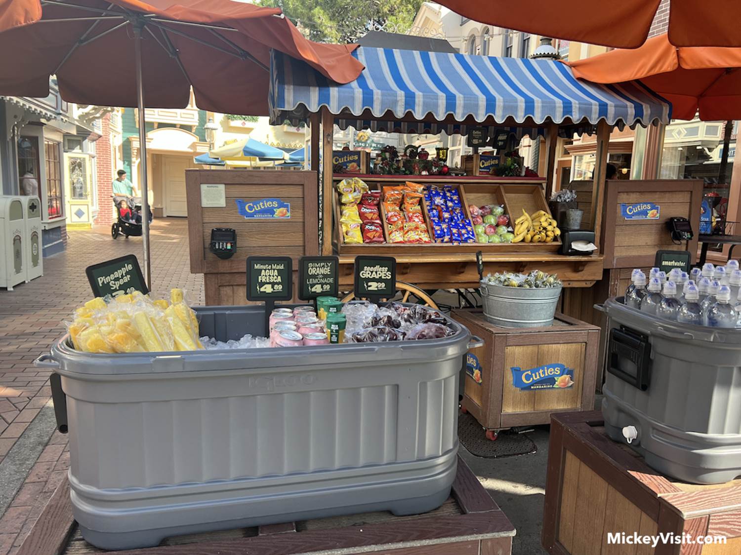 1) Find healthy snacks at fruit stands. If you’re looking for some smaller snacks to keep you full between meals, you’ll find several fruit stands throughout the parks. These stands will offer options like Cuties, apples, pineapple spears, pickles, hummus, mini Babybel cheeses, veggie cups, and more. These fruit stands provide a variety of healthy options if you’re looking for a quick and easy snack during the day!
