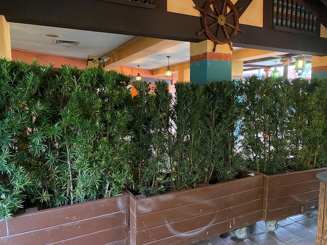 - While guests are able to walk near the ordering kiosks, large planters surround the restaurant's seating area preventing anyone from entering.