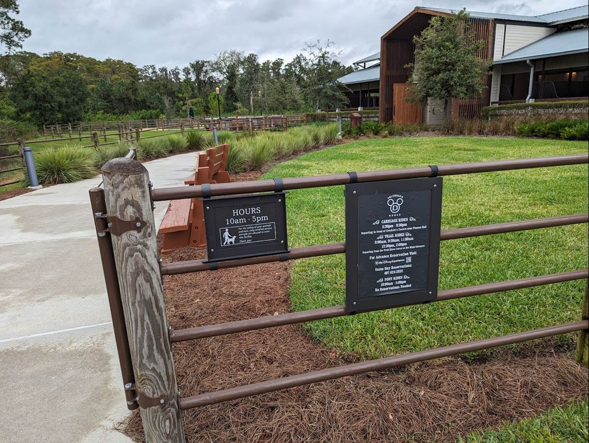 The stables near the Settlement area of Disney’s Fort Wilderness Resort & Campground are open from 10:00 AM to 5:00 PM daily. Guests are welcome to walk through the area and visit the horses. Pony Rides also depart from this location. The Trail Blaze Corral is located at the Main Entrance of Disney’s Fort Wilderness Resort & Campground. When checking in for horseback riding, guests are asked to visit the building with a large Tri-Circle-D Ranch sign near the Main Outpost parking lot.
