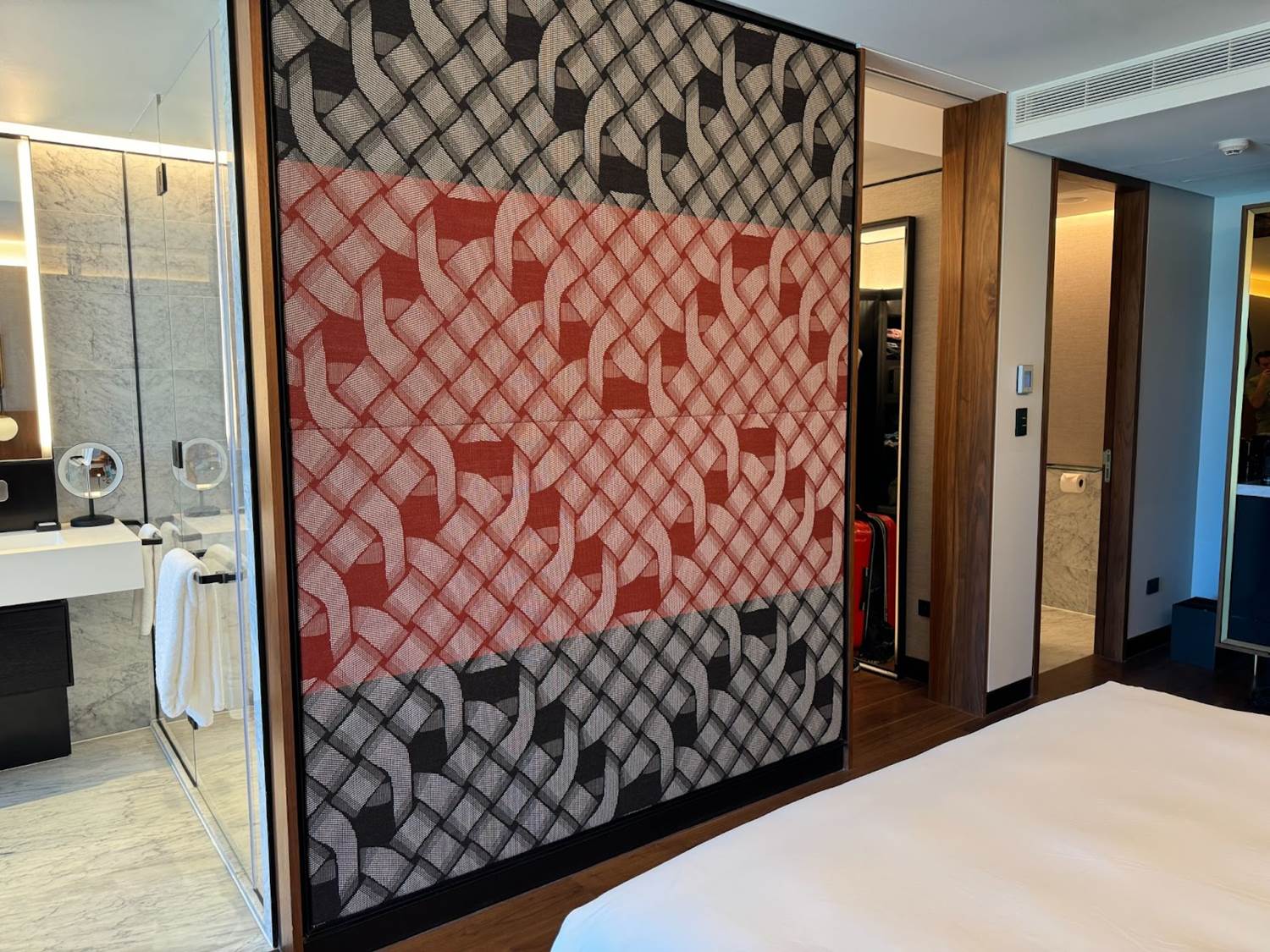 The interiors of the guest rooms are inspired by Māori craftsmanship. A fabric wall depicts a traditional weaving pattern.