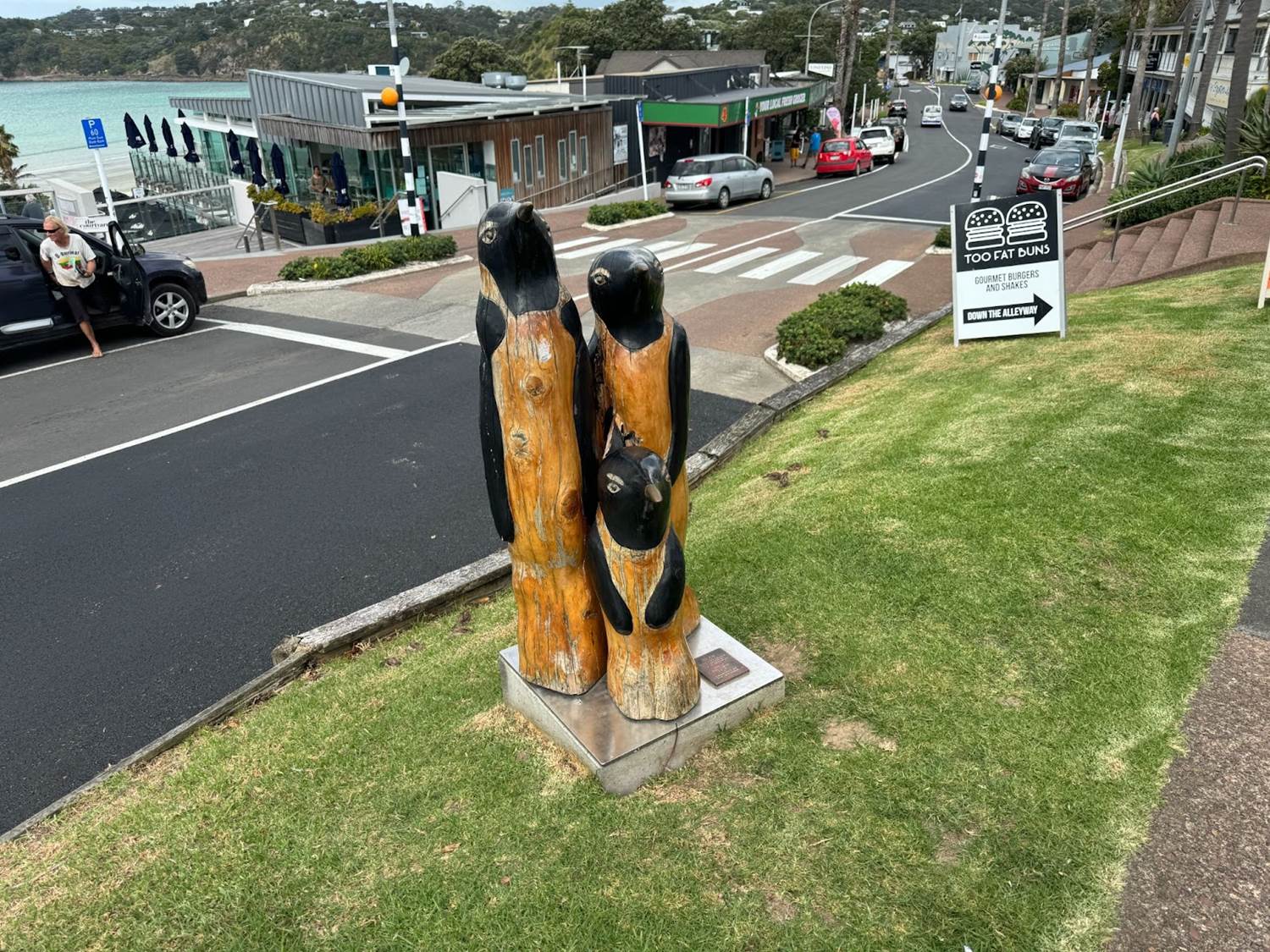 The ferry back to Auckland departed at 4:00, and we had about an hour to explore Oneroa, the main shopping and dining area of the island. There are lots of locally owned shops, art galleries, cafes, and bars on this stretch of land, including the ability to purchase local wines and honey. A lot of artists also call the island home, so the streets are lined with sculptures and art galleries. Having seen the Little Penguins yesterday, this waddling family seemed like a fitting inclusion for this post.