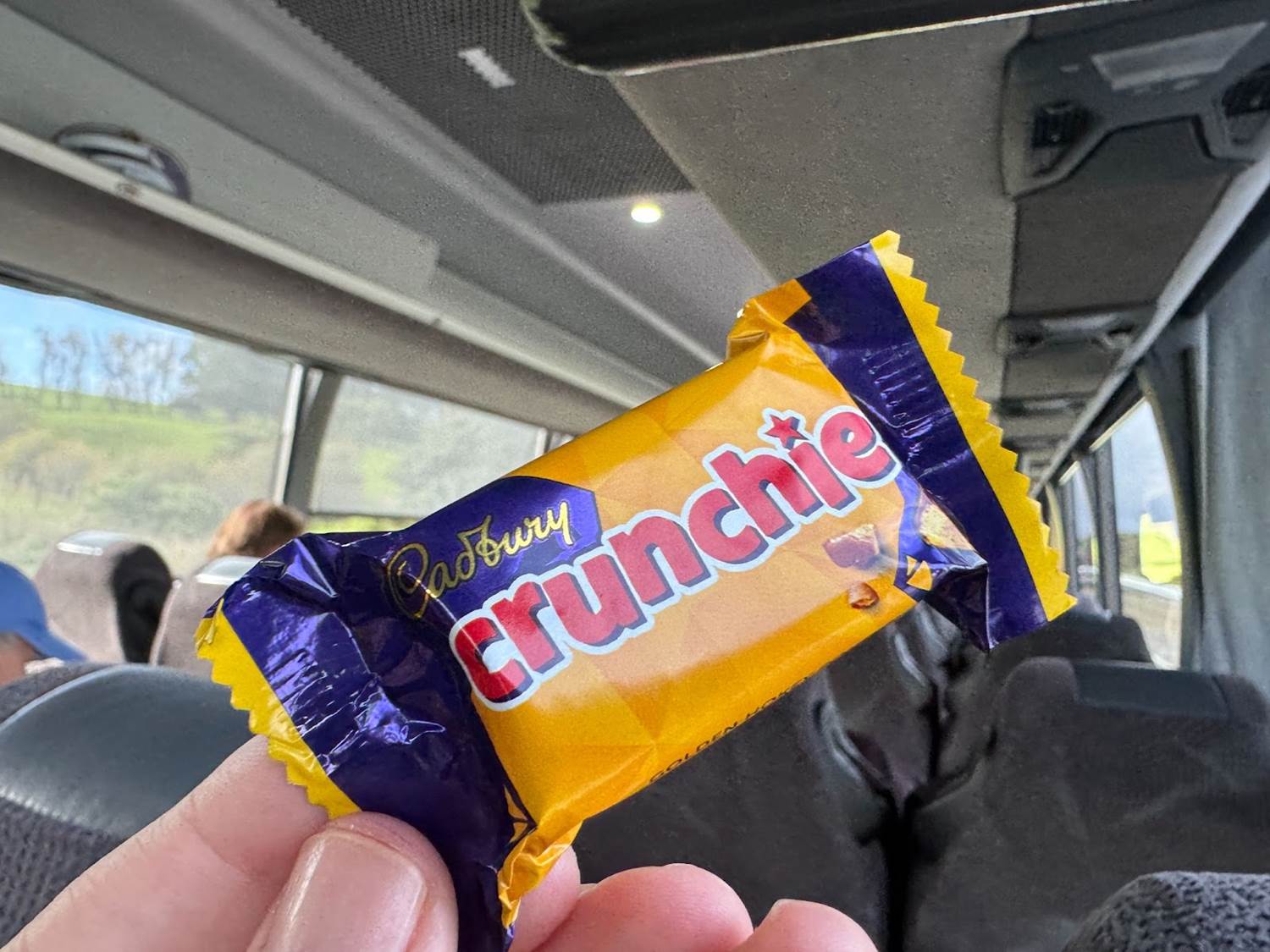After our first bathroom break, which included several options to purchase refreshments, it was back on the bus. Dusty and Danny introduced us to one of New Zealand’s (and Australia’s) favorite candies, a Cadbury Crunchie, which is chocolate-covered Hokey Pokey (the same stuff in the ice cream we tried on Day 3). It’s a bit like a Butterfinger, but less sticky and without the peanut butter.