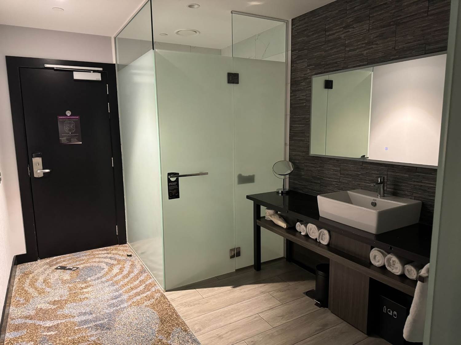 Maximizing space, these rooms have an open floor plan, with a toilet and shower behind frosted glass booths on either side of the sink.