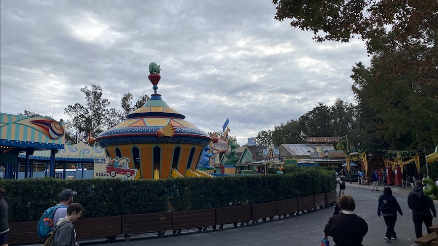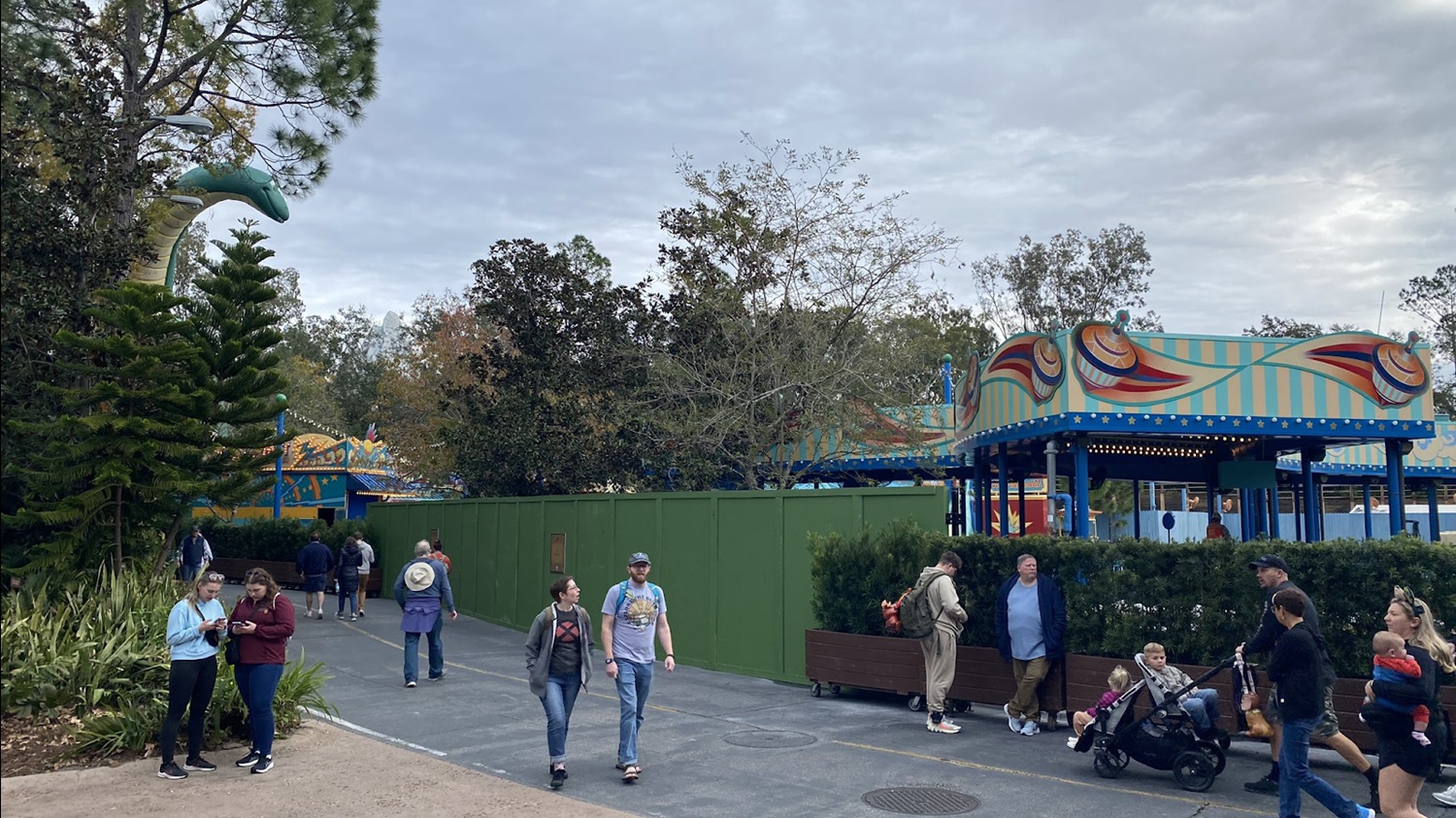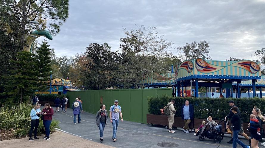 Walls surround TriceraTop Spin, the carnival games, and the merchandise location as work is set to begin on the land and Encanto attraction.