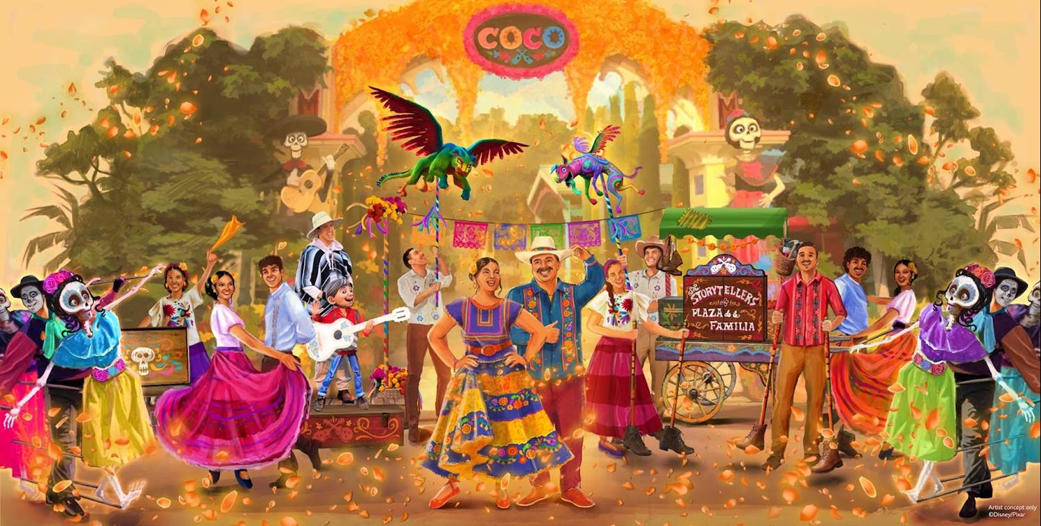 - “The Storytellers of Plaza de la Familia Celebrate The Musical World of Coco!" will bring to life the everlasting bonds of family with songs, dancing and the whimsical figure of Miguel. Guests will also see colorful representations of the spirit guides, Dante and Pepita.