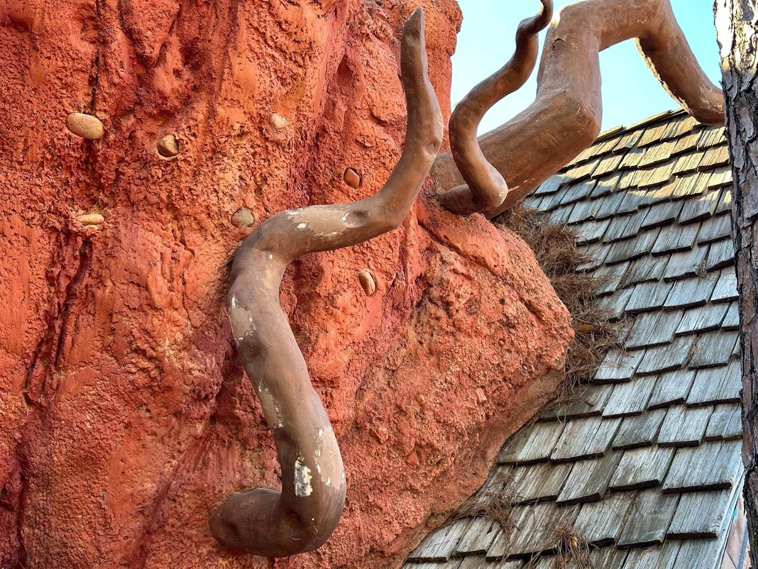 Around the side of the attraction near the former Briar Patch gift shop, many of the thorns remain, along with the previous color scheme of the rock work.