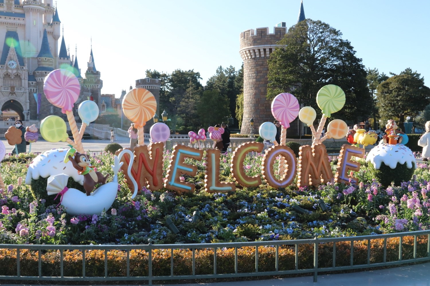 Upon entering the park, guests are immediately greeted with colorful decorations featuring Vanellope von Schweetz from Wreck-It Ralph.