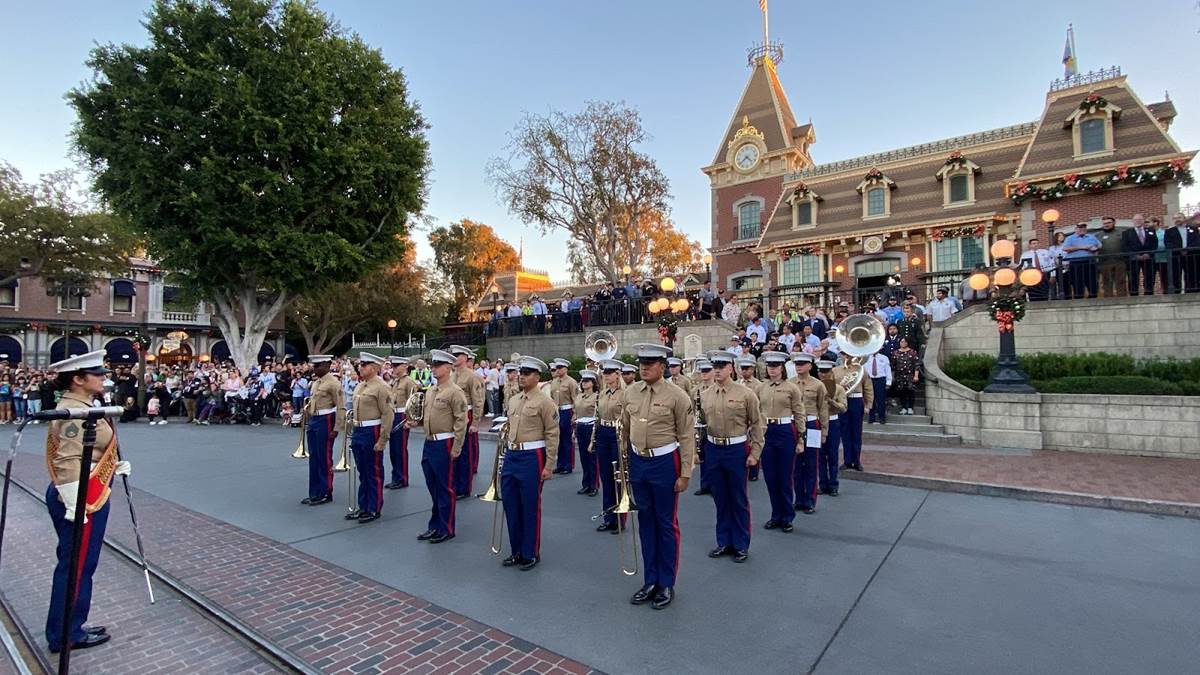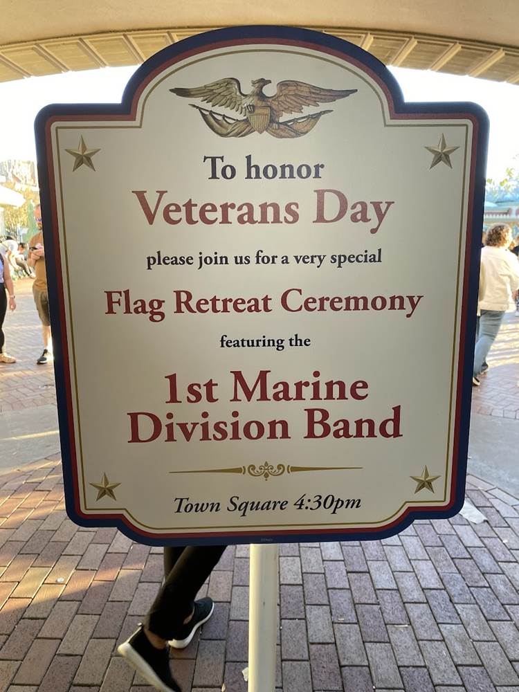 For Veterans Day, Disneyland’s daily flag retreat ceremony included the 1st Division Marine Band and other special guests.