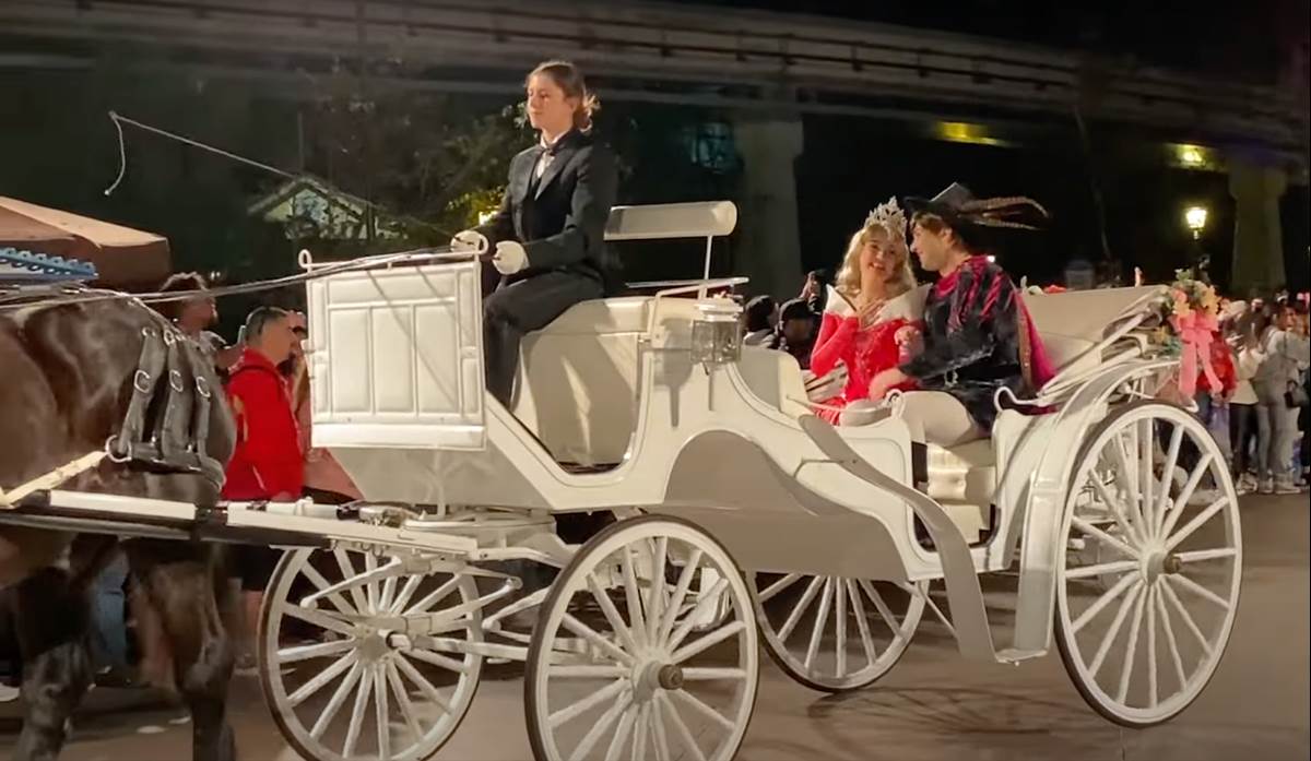 - Other characters also arrive by horse-drawn carriage, including Aladdin and Jasmine, Aurora and Phillip, Rapunzel and Flynn, and even the Ugly Stepsisters and Stepmother.