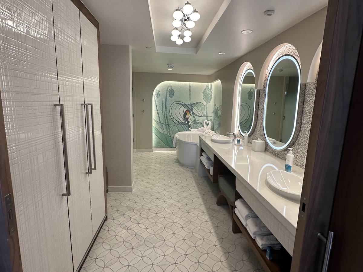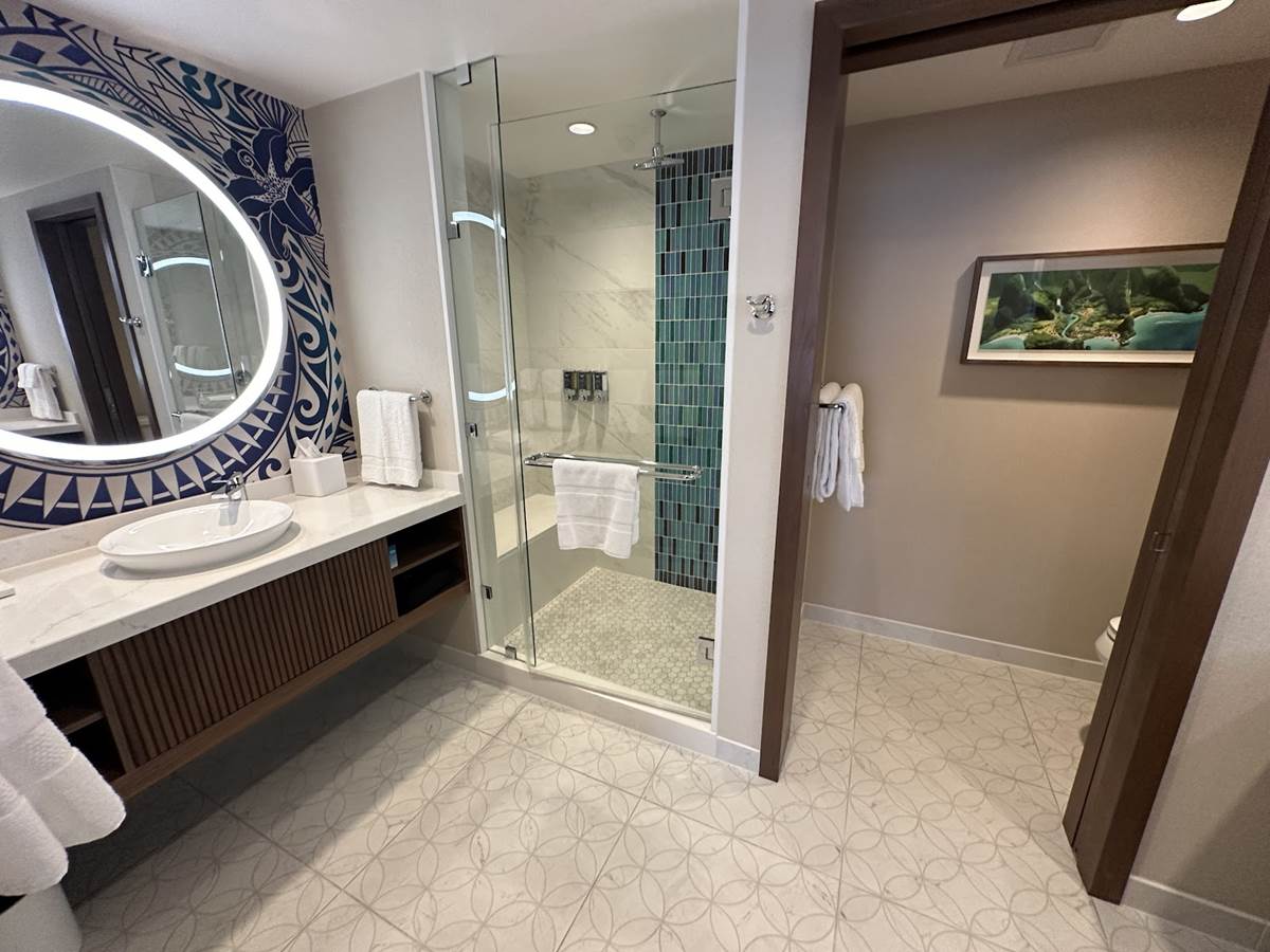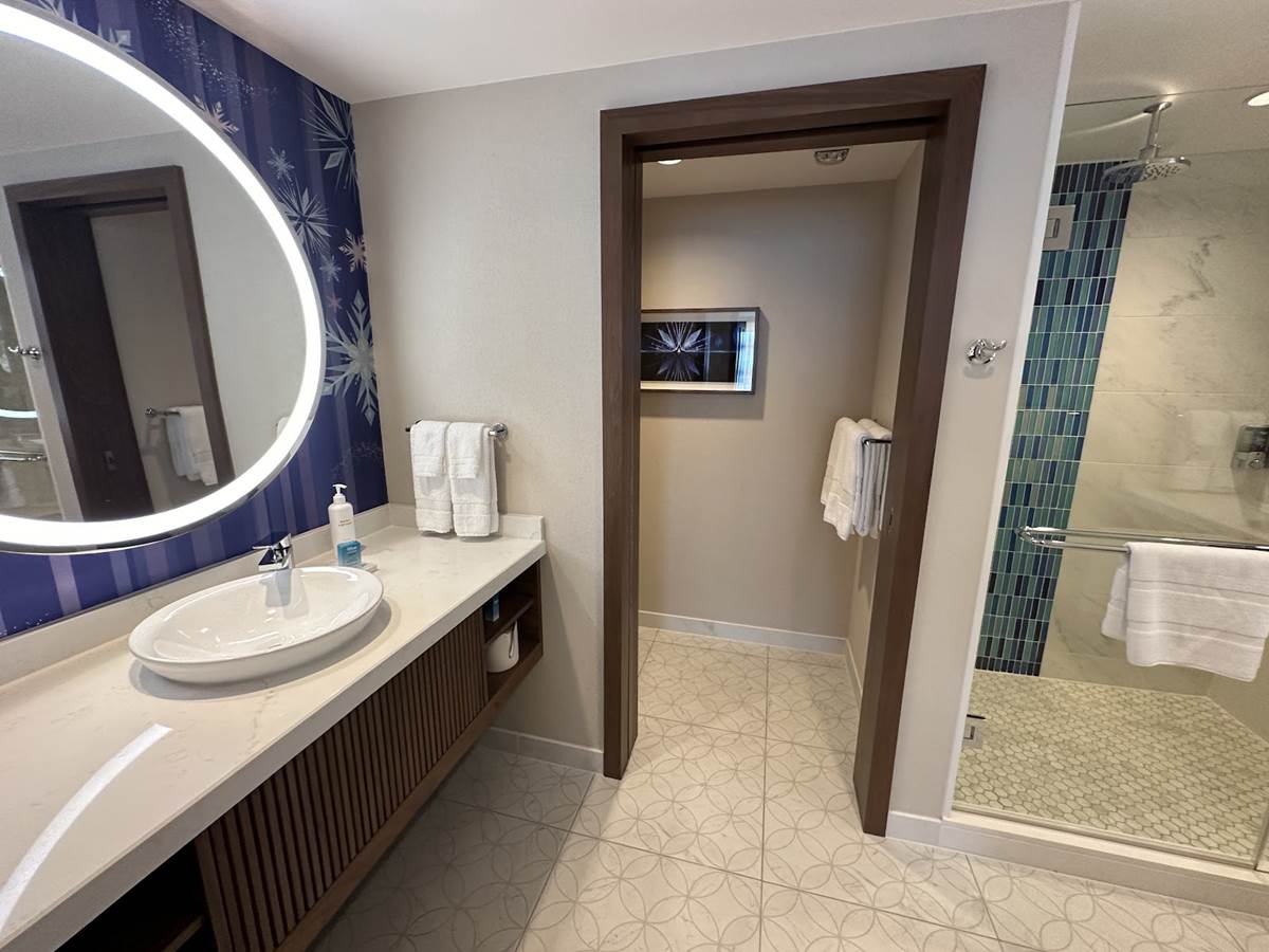 One- and two-bedroom villas offer roomier accommodations for larger families, sleeping up to five and nine guests, respectively. The villas include a full-size kitchen and living areas with comfortable sofa seating that can be easily pulled down to reveal a queen-size bed, complete with a story-themed mural above inspired by The Princess and the Frog or Fantasia. The comfort continues into the main bedroom, which includes a spacious en-suite bathroom featuring double vanities, a soaking tub with a themed mosaic-style tile mural and a spa-like shower.