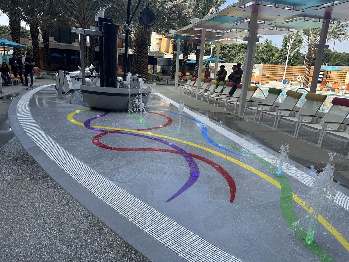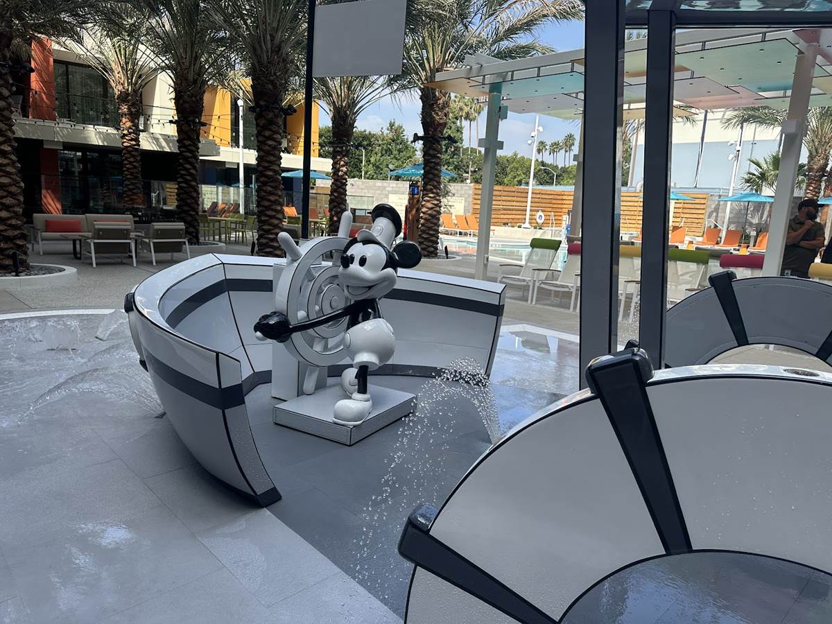The brand-new Palette Pool area offers an inviting oasis perfect for relaxation and play. Guests can unwind in the crystal-clear, palette-shaped swimming pool or enjoy refreshing snacks and drinks at the Palm Breeze Bar (opening later this season). This delightful outdoor space boasts decor inspired by the distinctive artistry of Disney Legend Mary Blair. Little ones can cool off at the whimsical “Steamboat Willie" splash pad inspired by the iconic short film. Kids can star in their own story by joining the iconic Mickey Mouse at the helm of the boat brought to life with waterfalls, fountains and misty fog effects.