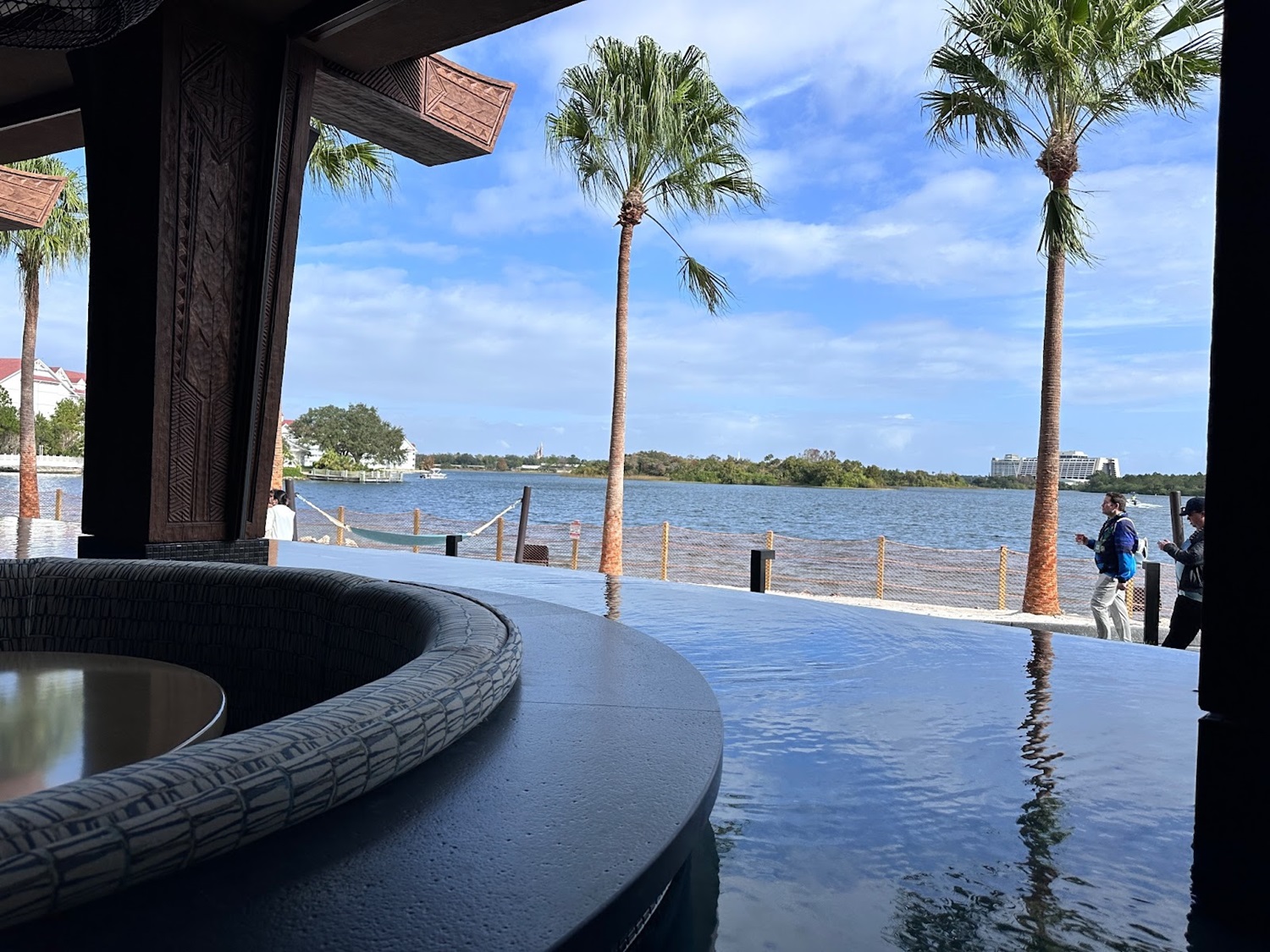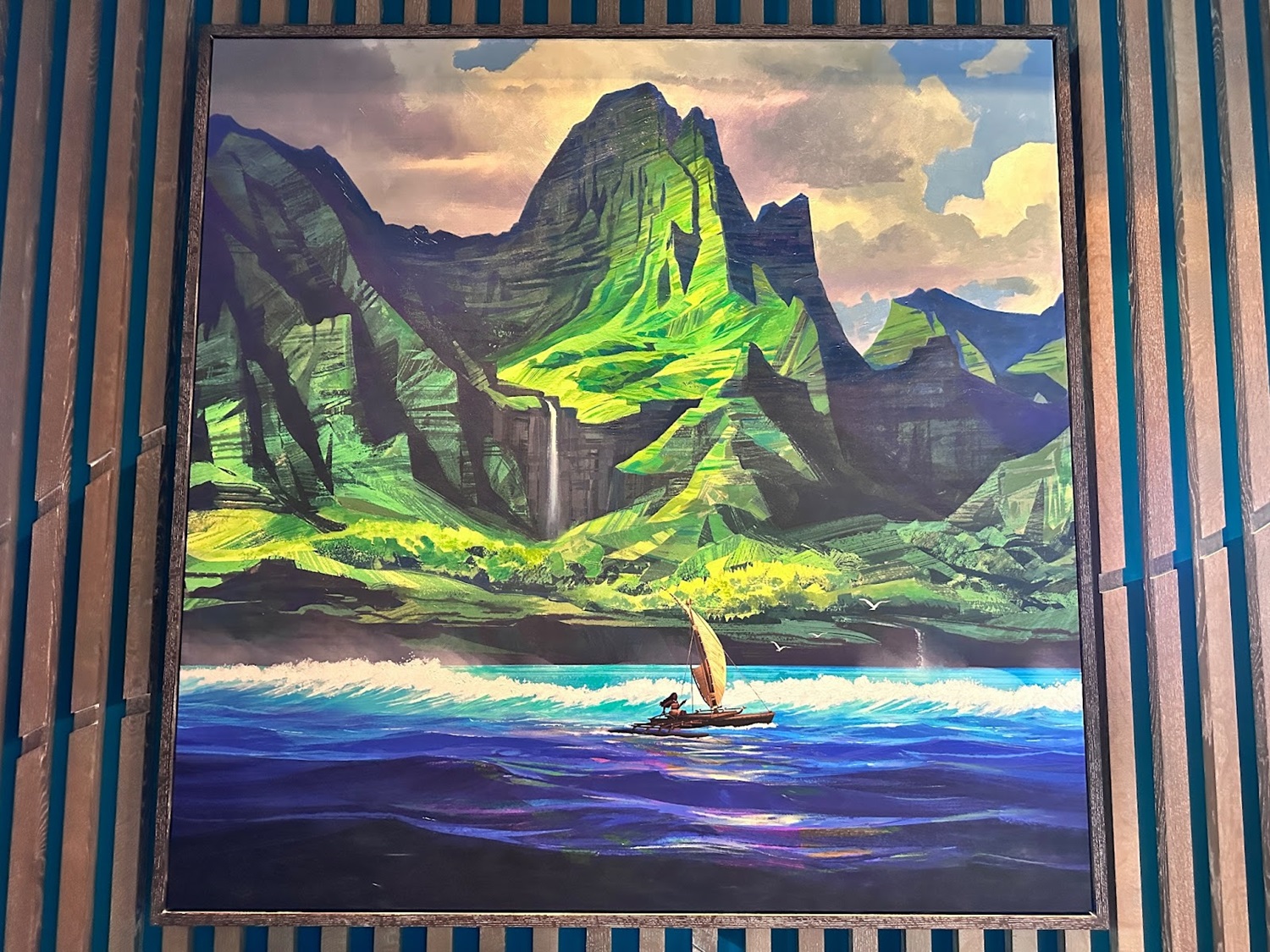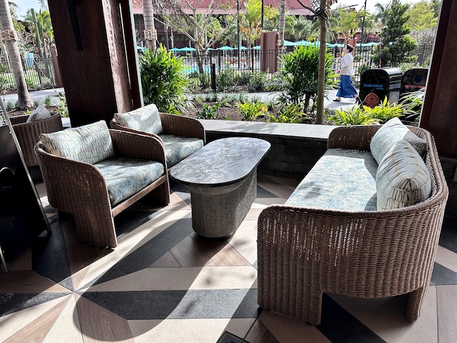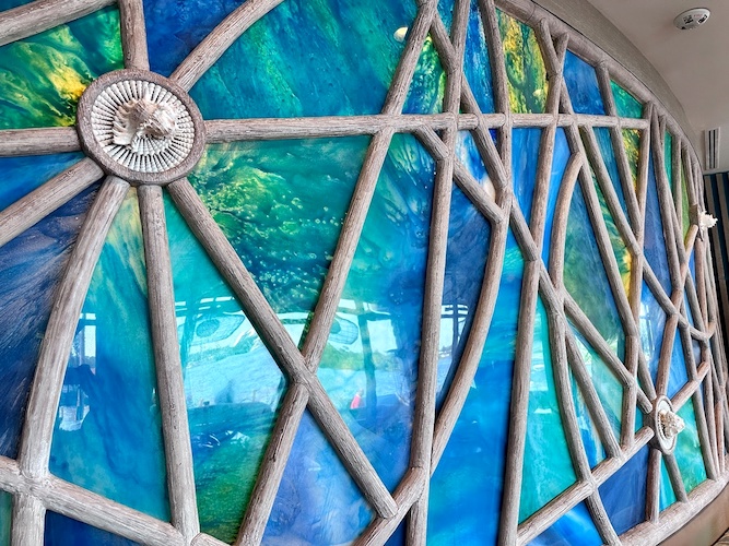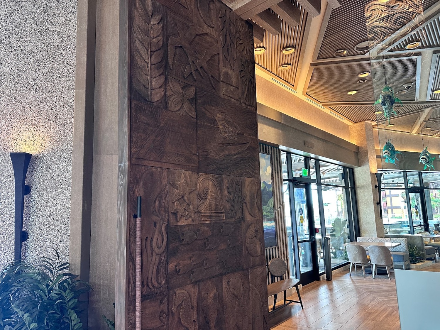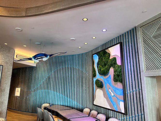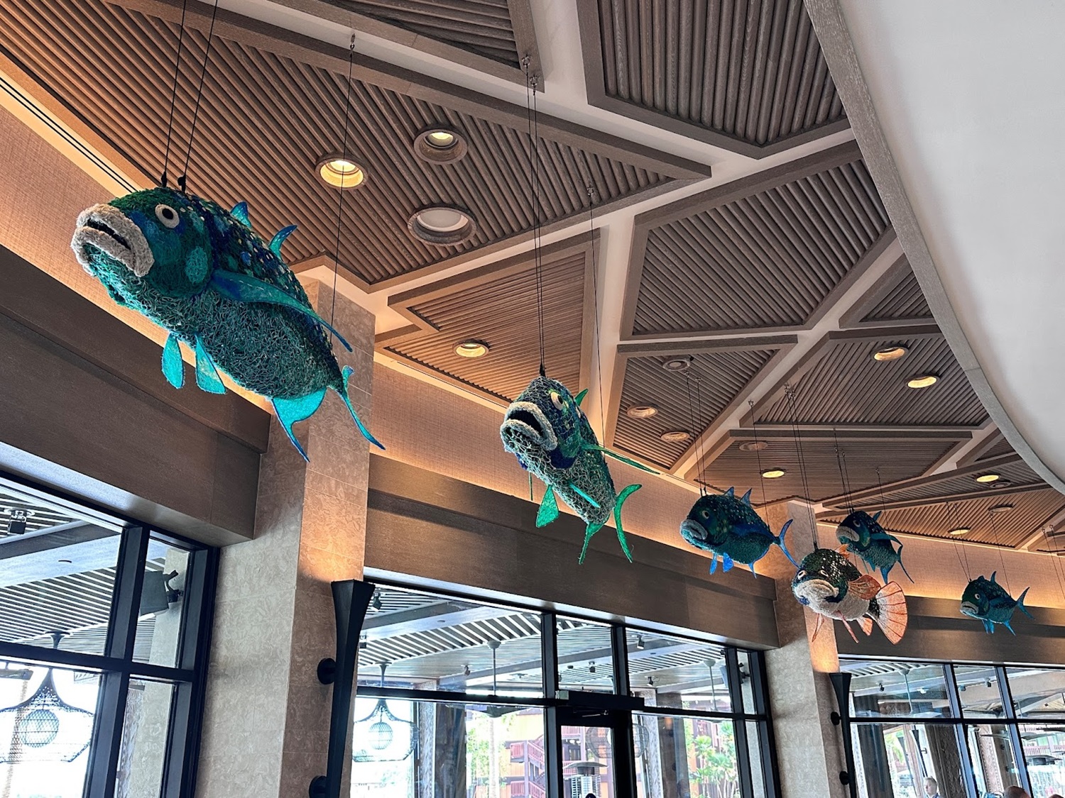 As you take in the stunning views of Seven Seas Lagoon, you'll be surrounded by stunning Polynesian-themed artwork, some made from recycled materials and fishing nets.