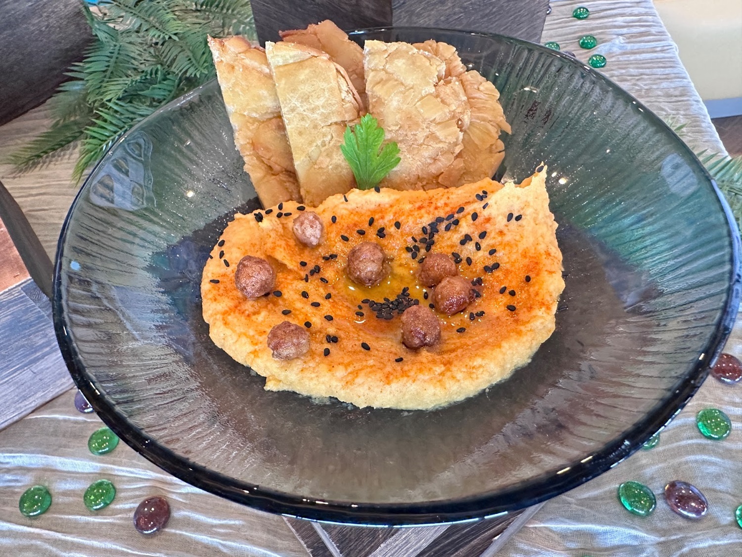- Sweet Potato Hummus with crispy chickpeas, espelette pepper dust, and breadfruit tostones