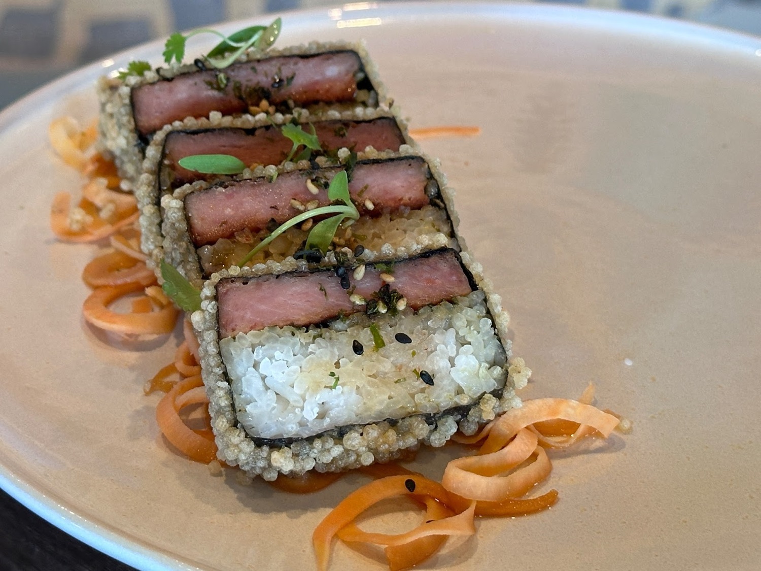 - Spiced Ham Musubi with glazed spam seasoned with traditional furikake and served with crispy rice pearls