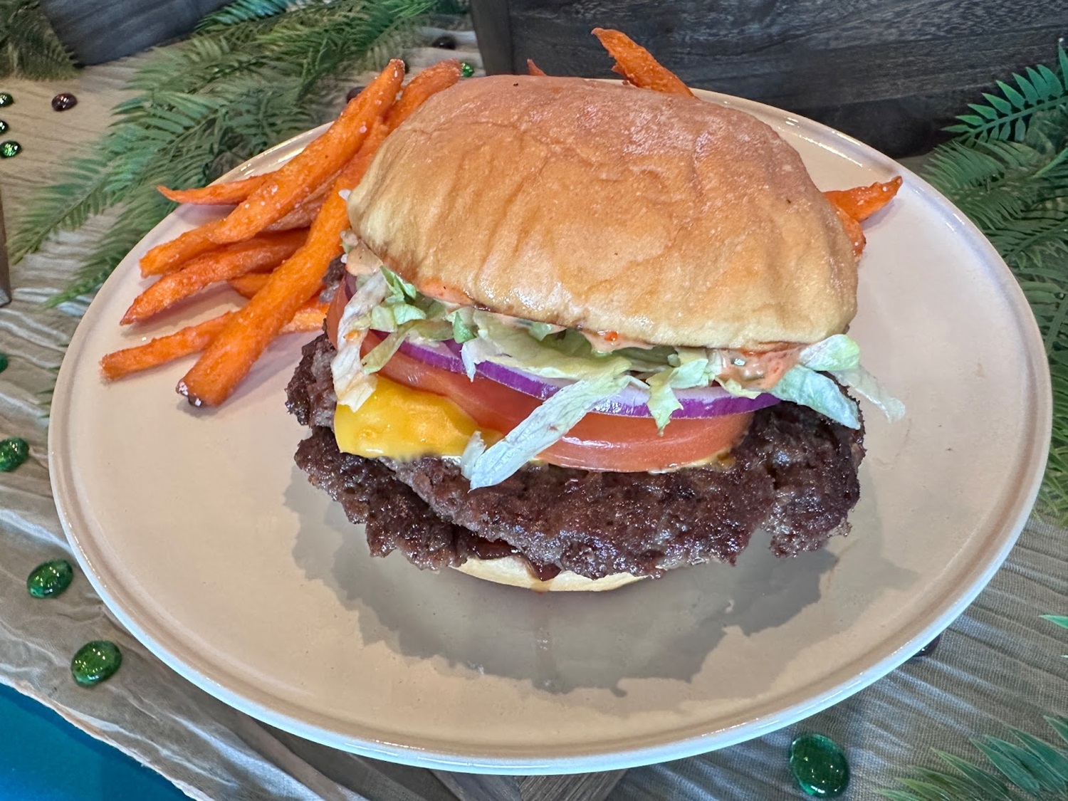 - Wayfinder Burger: Two pressed patties, American cheese, onion jam, volcano sauce, and sweet bun served with mac salad or sweet potato fries