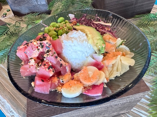 - Poke Bowl: Sushi-style rice, pickled cucumbers, vegetables, spicy poke sauce, and macadamia nuts with choice of ahi tuna, grilled teriyaki chicken, or grilled tofu