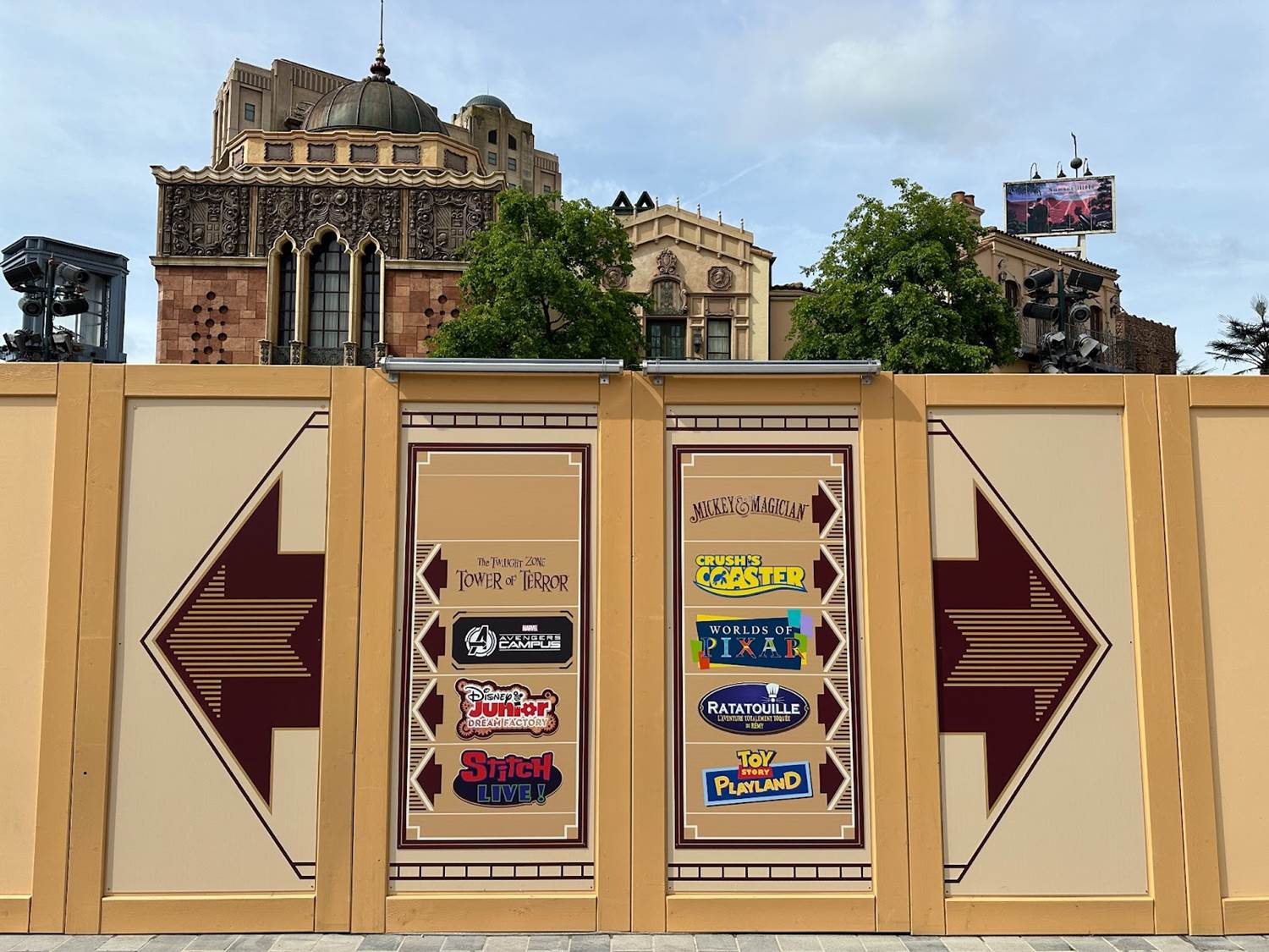 The entrance to Studio 1 is blocked off by a series of construction walls, featuring concept art for some of the various changes coming to the soon-to-be renamed Disney Adventure World.