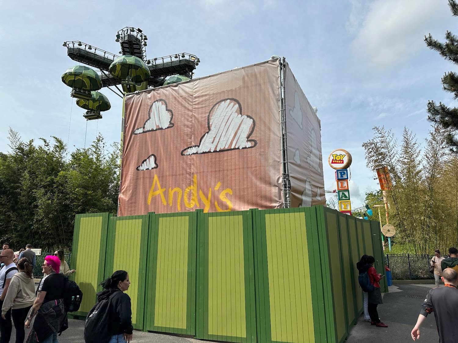 Over in Toy Story Playland, the Buzz Lightyear statue has been covered over in tarps that cleverly feature Andy’s name.