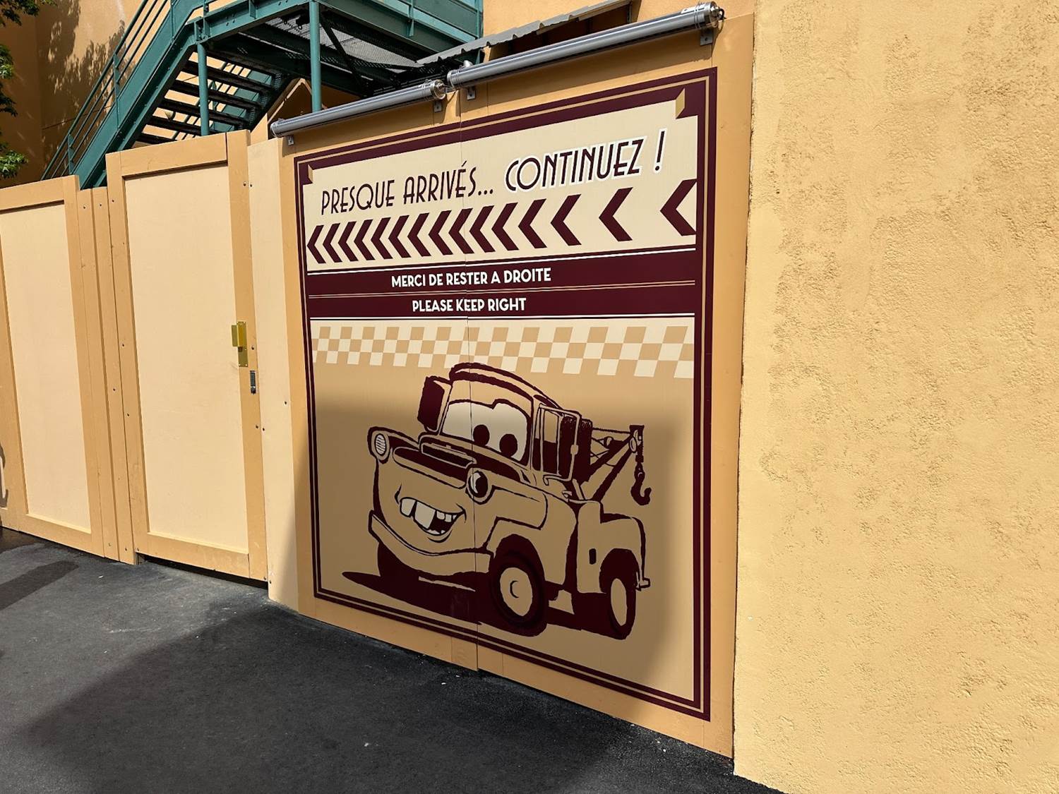 While Studio 1 is closed, guests are directed to a temporary pathway to the left of the building, featuring some light Cars touches on walls.