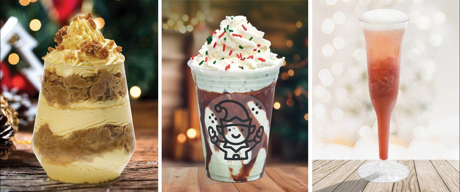 - Festive Shake: Cookie butter milkshake with caramel drizzle and holiday sprinkles topped with a Christmas tree cupcake