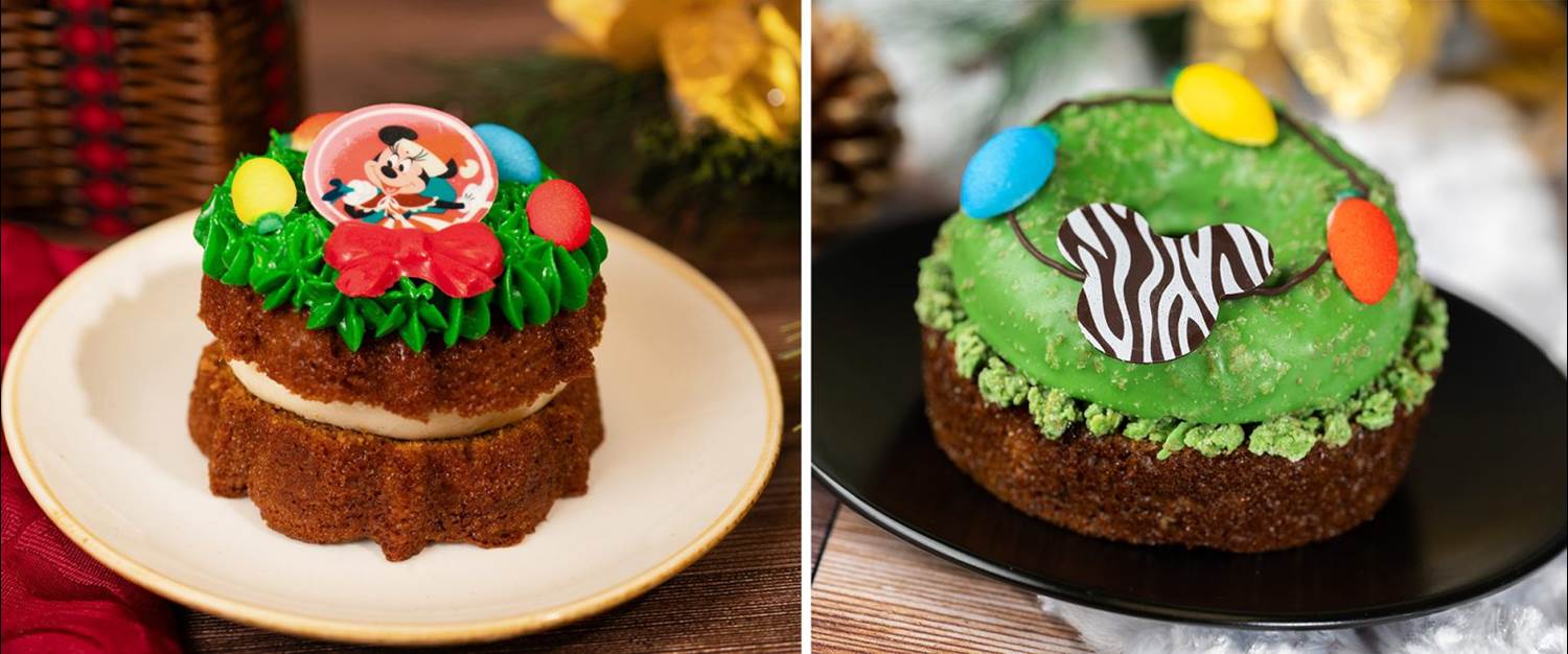- Festive Tart: Vanilla tart shell with banana cake, caramel sauce, matcha crunch, chai mousse, and green magic shell topped with holiday lights and animal print Mickey (New)