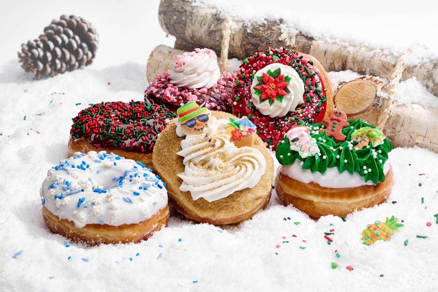 - Holiday Donuts: Six pack of Christmas donuts celebrating the season with a snowman, palm tree adorned in lights, poinsettias, colorful sprinkles, and peppermint décor