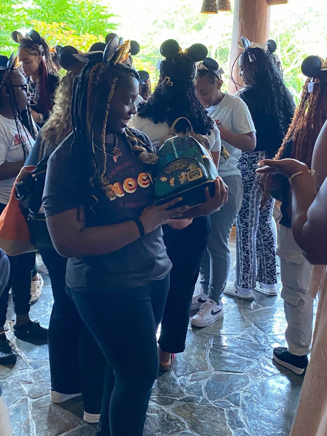 Staying at Disney’s Animal Kingdom Lodge, the group of students were treated to some of the finest restaurants on property, including Jiko, as well as the aforementioned Victoria & Albert’s. To commemorate the journey, they also were given a number of Tiana-themed merchandise items, including signature ears and a MagicBand+, all which could be packed in their Loungefly bags.