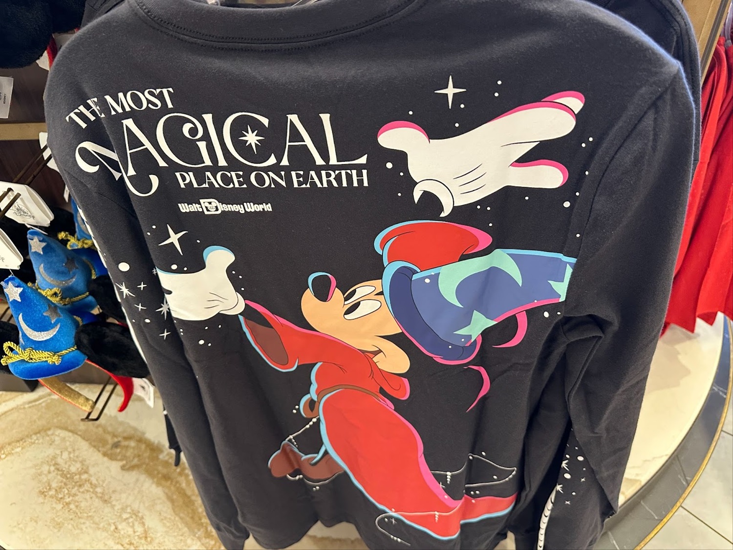 This grey crewneck features Sorcerer Mickey on both the front and back, with magical pixie dust accents decorating the sleeves. The Walt Disney World logo is boldly placed on the left sleeve, with “The Most Magical Place on Earth" printed on the back.