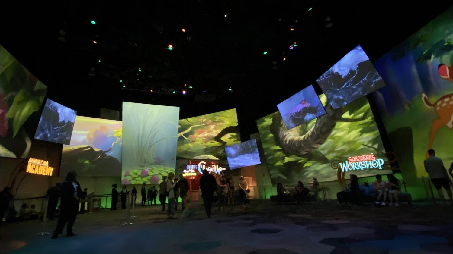 That’s not to say that there is no place for a celebration of the artform that the Walt Disney Company was built upon. Disney’s California Adventure’s Animation building is a great example. Though individual components have disappeared or been changed (Ursula’s Grotto was removed to make way for Anna and Elsa’s meet & greet, Beast’s Library was closed for space for Disney’s Imagination Academy), the spirit of the building has largely been the same. They even took out the film, Drawn to Animation, wherein “an artist" would interact with Mushu to explain character design, and replaced it with the increasingly popular Animation Academy. The experience formerly featured a handful of characters that guests would learn to draw, but has now become so popular that an expanded number of characters are taught, and necessitate their own schedule outside the theater that shows when the lessons are and how difficult they might be. All of these exhibits and experiences are accessed through a massive lobby that features the art and clips from Walt Disney Animation Studios and Pixar Animation Studios films on a rotating musical loop.