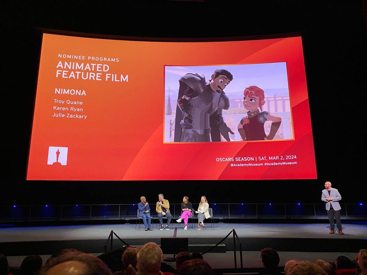 The third nominee for Best Animated Feature is Netflix’s Nimona, which was originally in development under Blue Sky Studios until it was canceled with Blue Sky’s closure (after The Walt Disney Company’s acquisition of 21st Century Fox) in 2021. Director Troy Quane was present with producers Karen Ryan and Julie Zackary to talk about how they “made Nimona twice. It started ten years ago and it was really special. The entire crew became a part of it. We all felt like we were doing something really special." They mentioned how the movie survived a studio merger, closure, and acquisition after being delayed due to the COVID-19 pandemic. “Filmmaking is stubbornness," they commented. Then they turned to the original graphic novel by ND Stevenson. “People fell in love with the characters. When you take over something like that, you just don’t want to screw it up."