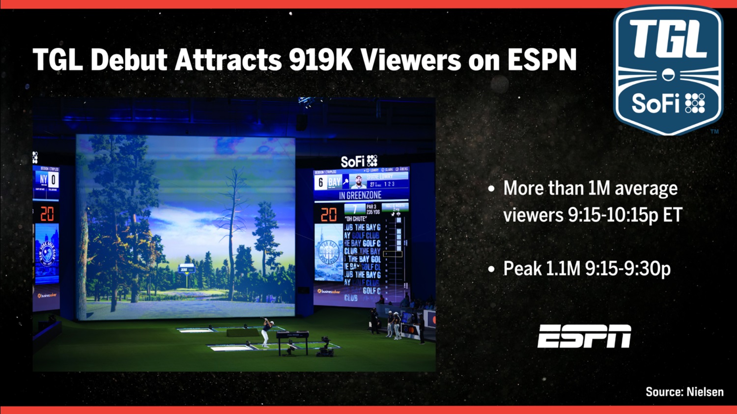 - The first event of TGL, sponsored by SoFi, drew an average of 919,000 viewers on ESPN on Tuesday night.