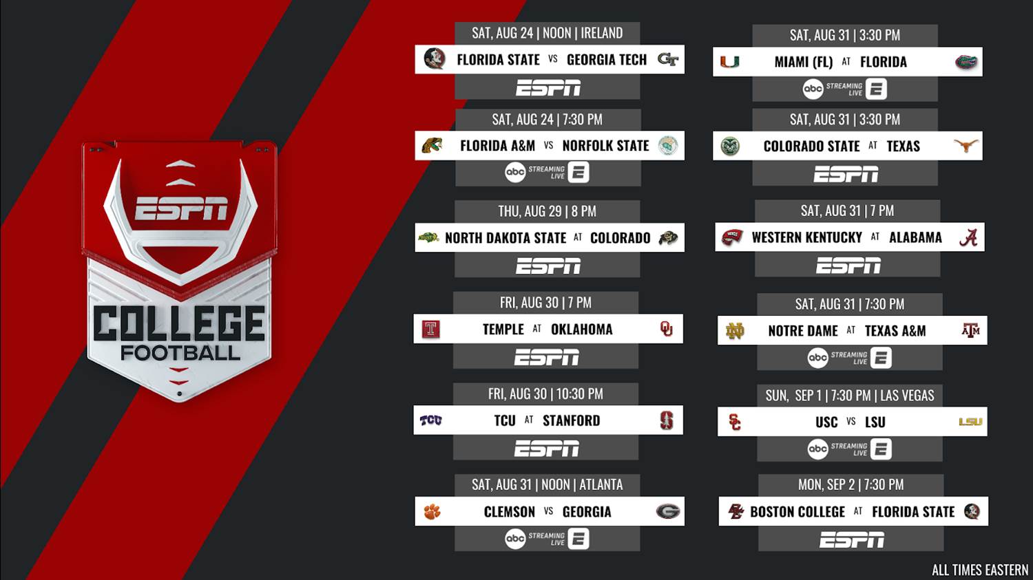 - Before Disney Advertising’s annual Upfront presentation in New York on Tuesday, ESPN is revealing some of the marquee games that will kick off the 2024 college football season – one of the most anticipated years in the history of the sport.