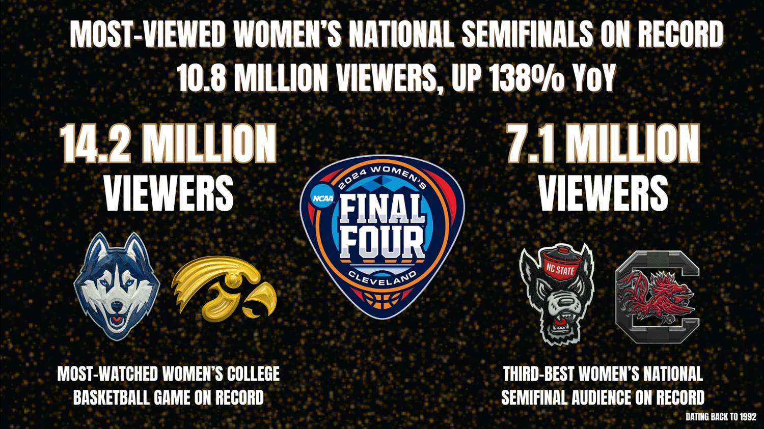 The NCAA Semifinals on ESPN has shattered viewership records, with the UConn-Iowa game seeing 14.2 million viewers, and Friday’s NCAA Women’s Final Four with an average audience of 10.8 million.