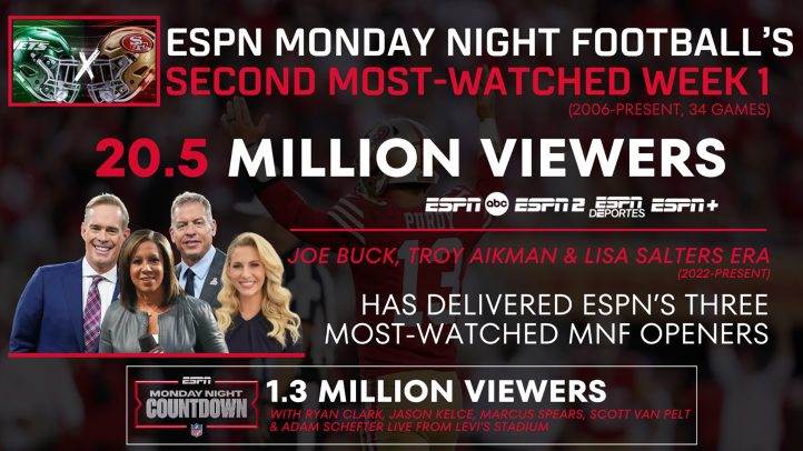- TVs all over were tuned in to ESPN’s Monday Night Football 2024 season opener as it had 20.5 million viewers.