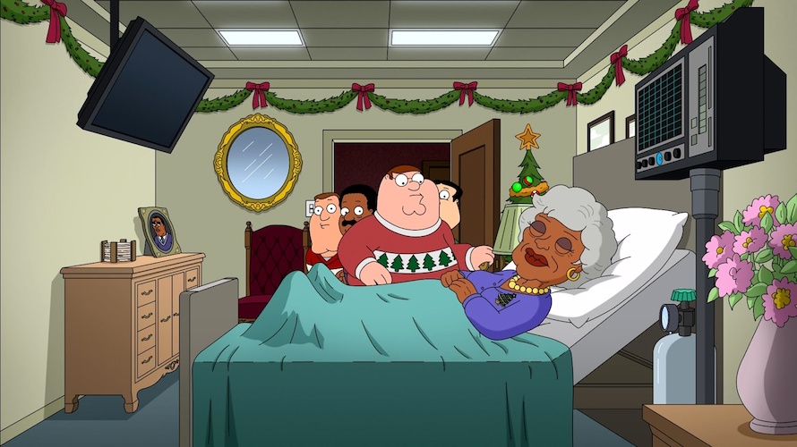 At Rikers Acres Maximum Security Nursing Home, Peter and his three best friends sneak in with a Werther’s hard candy truck and then disguise themselves as exterminators who are there to “spray the urine aroma." Upon entering Lloyd’s mother’s room, Peter is easily able to take the brooch off of her, prompting Cleveland to comment, “This really was not as hard as you made it out to be." At home on Christmas Eve, Stewie finally finishes his letter to Santa, concluding that he’s been “a perfect angel" and deserves “lots and lots of presents." But then he notices Meg’s stocking hanging above the fireplace and changes his mind, confessing to the accident and asking only for Meg’s return instead of any gifts for himself. After a magical overnight snowfall, Home Alone-style, Stewie wakes up and comes downstairs to find Meg hogtied under the Christmas tree. She doesn’t remember anything about what happened, but seems physically fine except her legs are on backwards. “Eh, close enough. Rush job. Busy night for Santa," remarks Stewie. Then Peter runs down the stairs and is thrilled to find a stick under the tree, though Lois reminds him that’s for Brian.