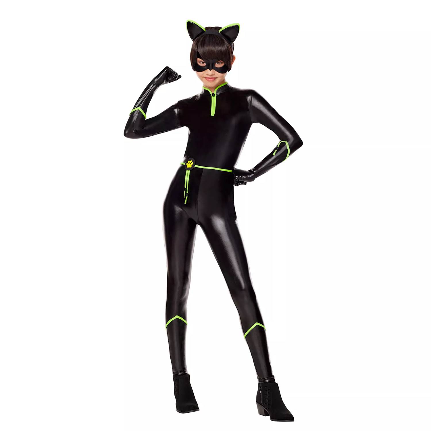 This sleek costume includes a black jumpsuit with vibrant green accents and an eye-catching paw print at the waist. A pair of black cat ears with bright green trim pair perfectly with a black eye mask.