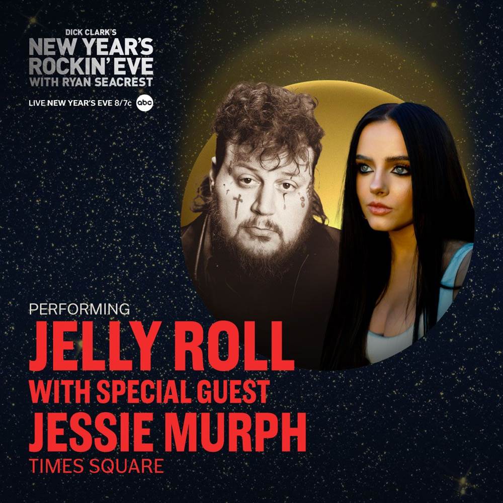 - Current two-time GRAMMY-nominated country superstar Jelly Roll will perform a medley of his hit songs live from Times Square and will be joined by singer and songwriter Jessie Murph. Jelly recently wrapped his sold-out 44-city 2023 Backroad Baptism Arena Tour and with his latest single, “Save Me," celebrated three back-to-back No. 1 singles from his record-breaking country debut album, “Whitsitt Chapel." This performance by Jelly Roll is sponsored by Carnival Cruise Line.