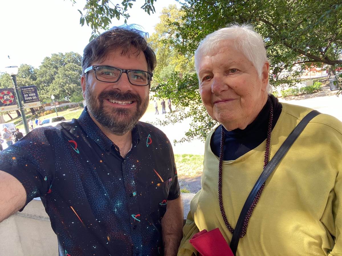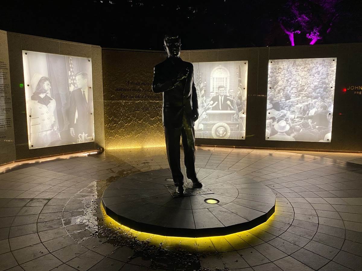 Our welcome dinner that evening was held at the Grace Fort Worth restaurant, just down the block from the Hilton. There, we met our fellow journalists and influencers who would be joining us on this trip and heard from the producers of JFK: One Day In America about their intentions with this new National Geographic documentary. We also met and interacted with Peggy Simpson, a reporter with the Associated Press in the 60s, who saw JFK’s motorcade that day and witnessed first-hand Jack Ruby’s slaying of Lee Harvey Oswald two days later. As someone who grew up fascinated by the events surrounding the JFK assassination, it was truly an honor to be in her presence (photo with Peggy from the following day at Dealey Plaza). After dinner, I went by the JFK statue again to see what it looked like lit up at nighttime.