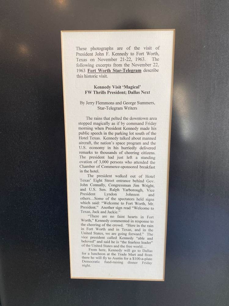 The first day of the trip was spent at the Hilton Fort Worth, which was formerly known as the Hotel Texas, and is most famously known as the building where United States President John F. Kennedy spent his final night. Outside the hotel stands a memorial JFK statue, marking the spot of his last-ever speech to the public before he headed to Dallas on that fateful day 60 years ago. I was thrilled to be able to peer down on the statue from my room, and I found it tremendously informative and inspirational to read about JFK’s speech that morning.