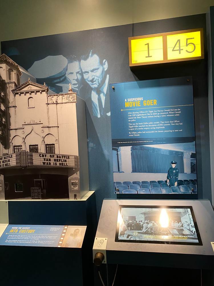 Our final stop on the tour that day was at the Texas Theatre, notably the location where Oswald was arrested after the assassination. I got a kick out of the Halloween decorations in the box office, and National Geographic had a step-and-repeat photo op for JFK: One Day In America set up in the lobby. And once again, it sent chills up my spine to sit in the seat that Oswald occupied in the movie theater’s auditorium prior to his arrest.