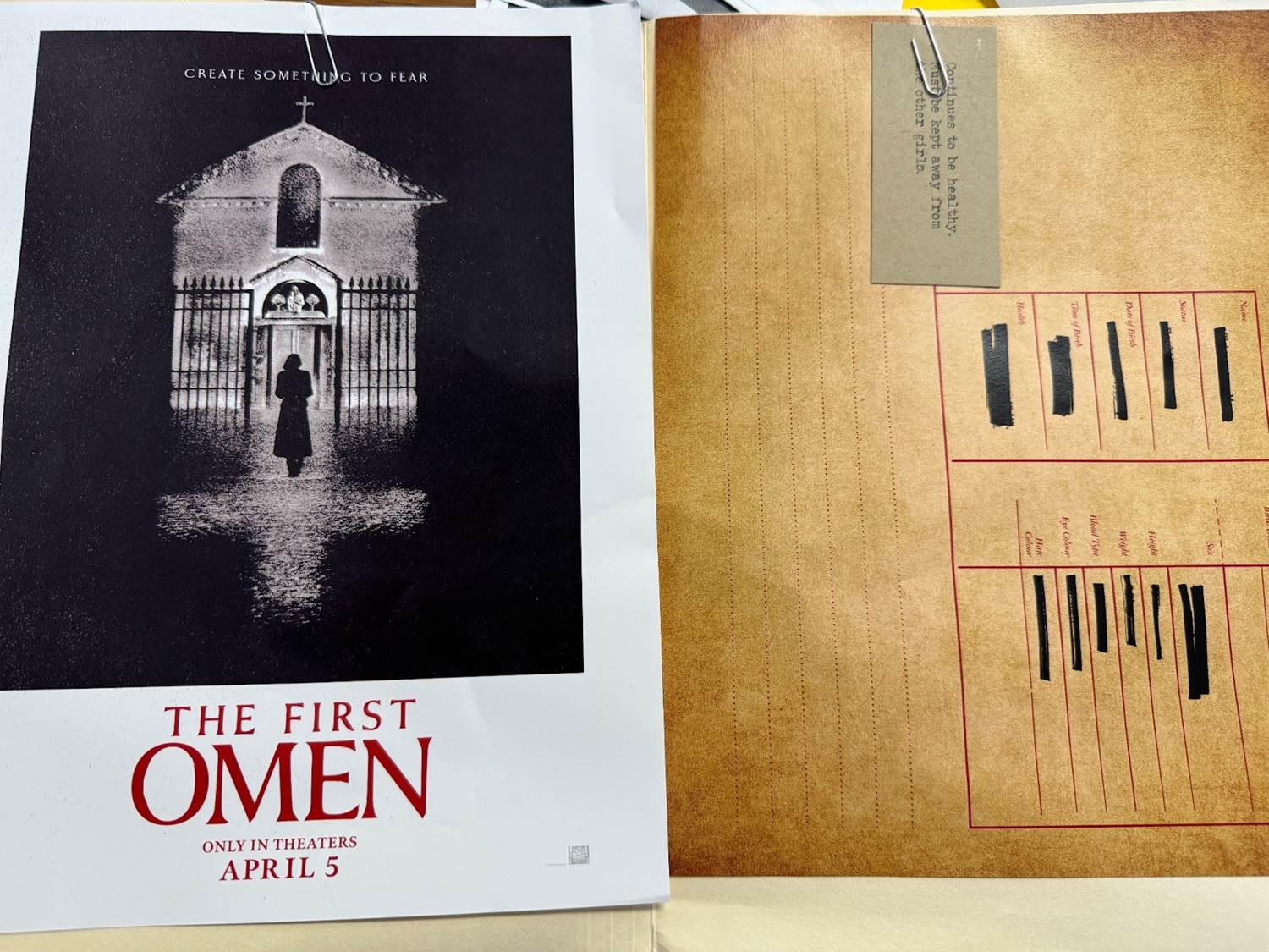 During the experience, a priest appears next to you and talks about evil coming while passing you a folder. After, a nun appears in screaming fashion, and a hand also appears. Here’s a look at the folder we received, which contained a small poster for The First Omen.
