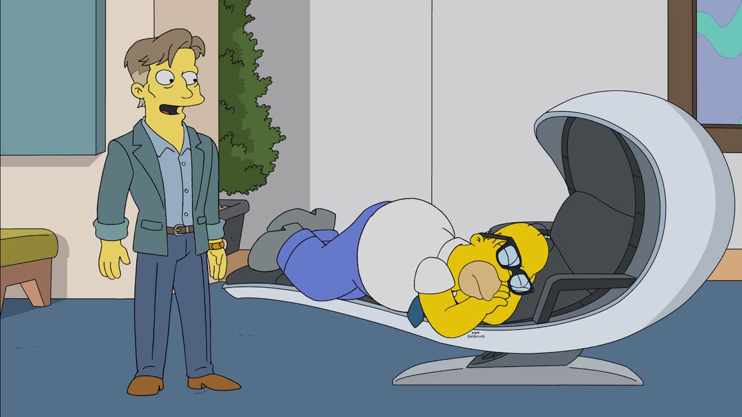 Cut to the present, with Homer (voiced, as always, by Dan Castellaneta) worrying that he’s lost his spirit of ambition, which we can see is true since he’s making this observation while downing his pal Barney Gumble’s (also Castellaneta) beer while Barney is in the bathroom of Moe’s Tavern. But it’s Homer’s lucky day that Professor Frink also happens to be drinking at Moe’s that day, and the two commiserate over their failed aspirations– though Frink is at long last able to prove to himself that he is indeed human by shedding a single tear, which he proceeds to collect with an eyedropper and store in a vial chained around his neck. And when Homer gets headhunted to work at a new nuclear power plant in Shelbyville (thanks to his ever-growing resume of odd jobs), Frink also agrees to be present as moral support for his interview on Zoom.
