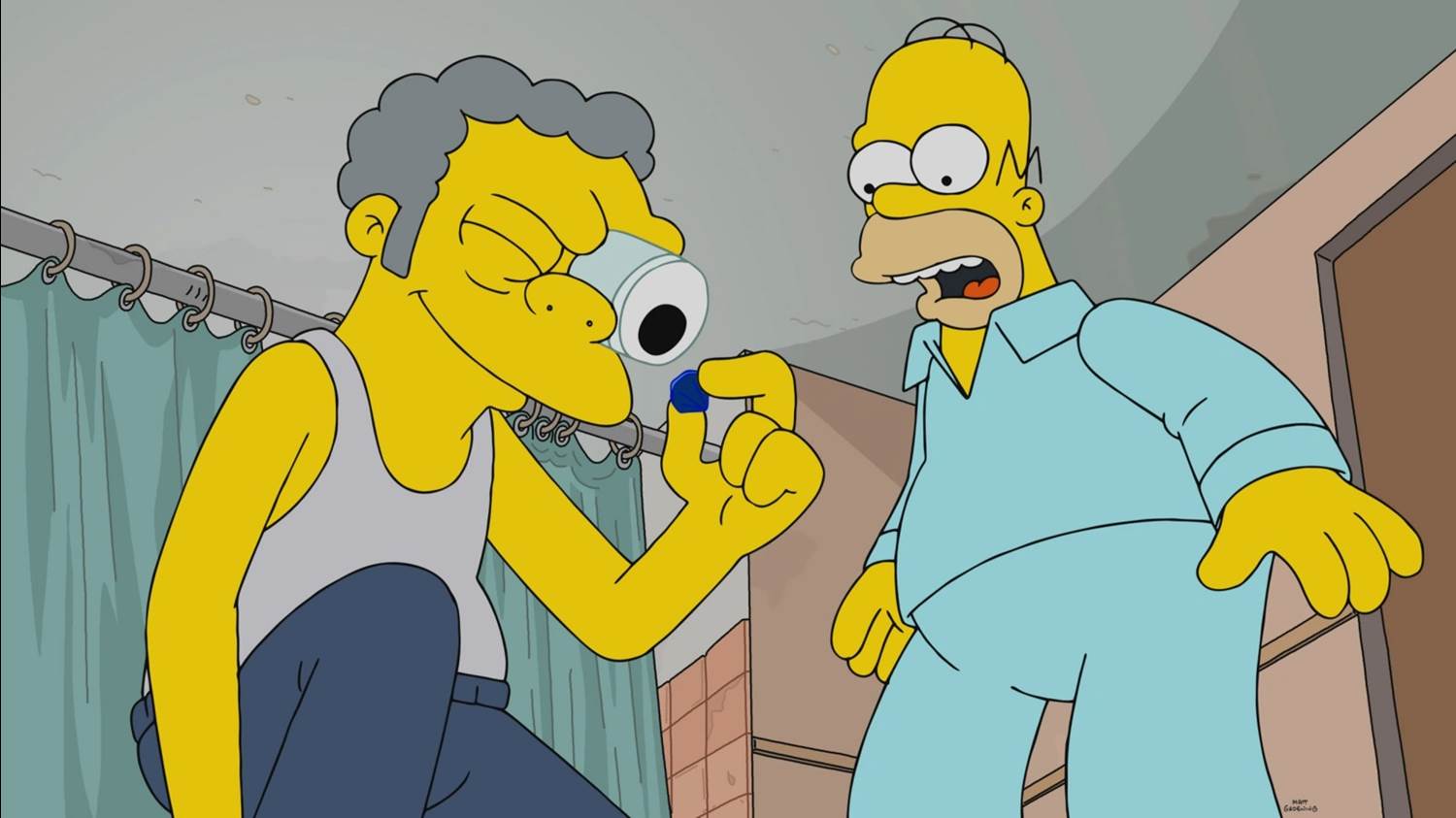 So after Larry’s mother presents them with a drawing he once made of them all in front of a waterfall, Homer, Moe, Lenny (Harry Shearer), and Carl (Alex Désert) all decide to take a road trip to spread Larry’s ashes in that same waterfall. This moment is accentuated by a stylishly animated dream sequence set to a parody of The Beatles’ “Eleanor Rigby," and soon the four men find themselves in Moe’s van on the way out into the wilderness. They stop at a motel, where they debate what happens to you after you die– Homer sticks to something resembling the Christian version of heaven, while Moe declares there’s nothing but a black void, and Lenny and Carl each come up with something in-between. It’s a surprisingly introspective moment for these four friends, and a welcome diversion from their usual antics. The next morning while going to the bathroom, Homer accidentally knocks over Larry’s urn and reveals that the barfly was smuggling sapphires when he was cremated. Moe stumbles into this secret as well, and convinces Homer to keep it from the other two members of their party.