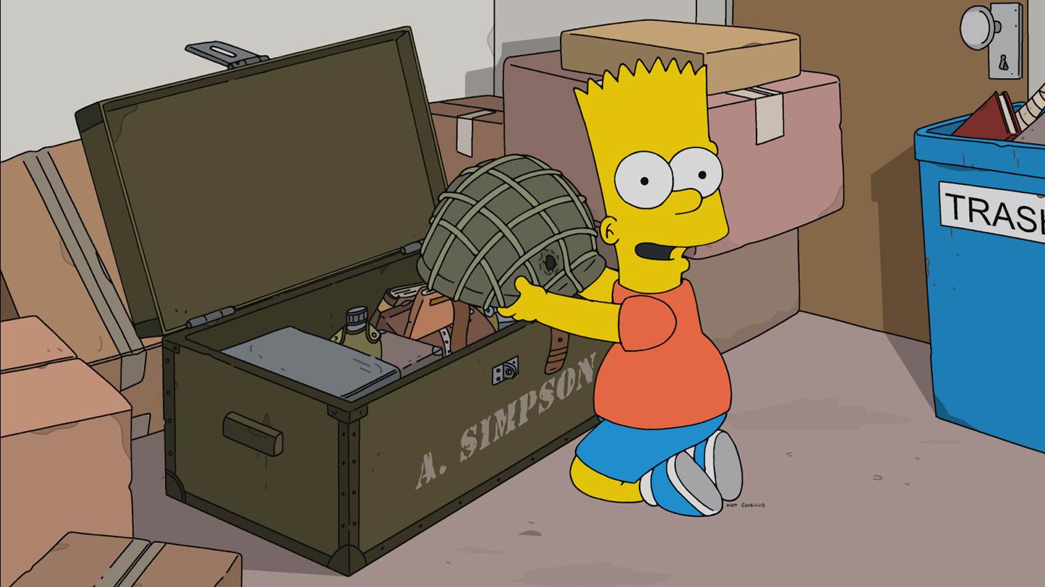 Due to last year's Hollywood writers’ strike, The Simpsons’ 35th season turned out to be an abbreviated one, with four fewer episodes than usual– not too bad considering the strike went on for five months. And the finale of that season is an interesting one, which begins at the Springfield Retirement Castle, where Homer (voiced, as always, by Dan Castellaneta) and Marge (Julie Kavner) surprise “Grampa" Abe Simpson (also Castellaneta) with the news that he’s moving into a smaller room that has recently opened up. And while this isn’t great news for Abe, it’s better for the rest of his family, who get to save money and also help him narrow down his possessions. During this process Bart (Nancy Cartwright) inherits a box of Grampa’s old war relics (which war did Abe fight in, exactly, at this point in The Simpsons’ ever-shifting timeline?) and immediately proceeds to sell them to Herman (Harry Shearer) down at the town’s Military Antiques store– I love seeing this character, who dates back to the show’s earliest days, pop up in his very irregular appearances– in exchange for an honest-to-goodness brain in a jar that he has on a shelf.