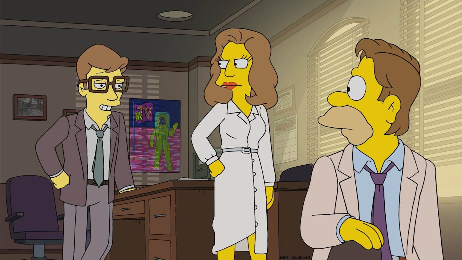 Now, having been a kid in the 80s myself (I was, in fact, Bart Simpson’s exact age when the show started in December of 1989) it’s super bizarre and unnerving to me to see Abe Simpson still relatively young in the Reagan era. But forcing myself to get past that, I was able to meet his detective-agency partner Billy O’Donnell (guest star Topher Grace from That 70’s Show) as we see a case unfolding via flashback involving an also-much-younger Agnes Skinner (Tress MacNeille), acting in the role of Kathleen Turner’s seductive character in this extended Body Heat riff. Agnes hires the private eyes to follow her boyfriend C. Montgomery Burns (Harry Shearer) who she believes is cheating on her. But after she finds out that Abe is saddled with a young son named Homer (Dan Castellaneta), O’Donnell is forced to take the lead on the case instead. Unfortunately he turns up missing almost immediately, and in the present the Simpson family is shocked to discover that their elderly patriarch wouldn’t even have bothered looking into the disappearance of his partner.